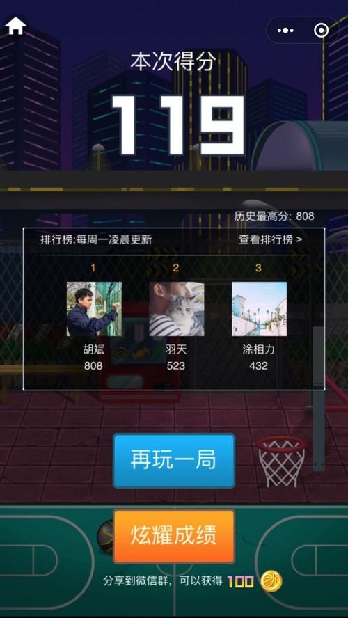 投篮的过程中触碰金币可以获得更多的积分,在规定的时间内获取最高分,游戏积分排行榜每周一更新一次,快来看看谁是朋友圈的微信灌篮高手吧。